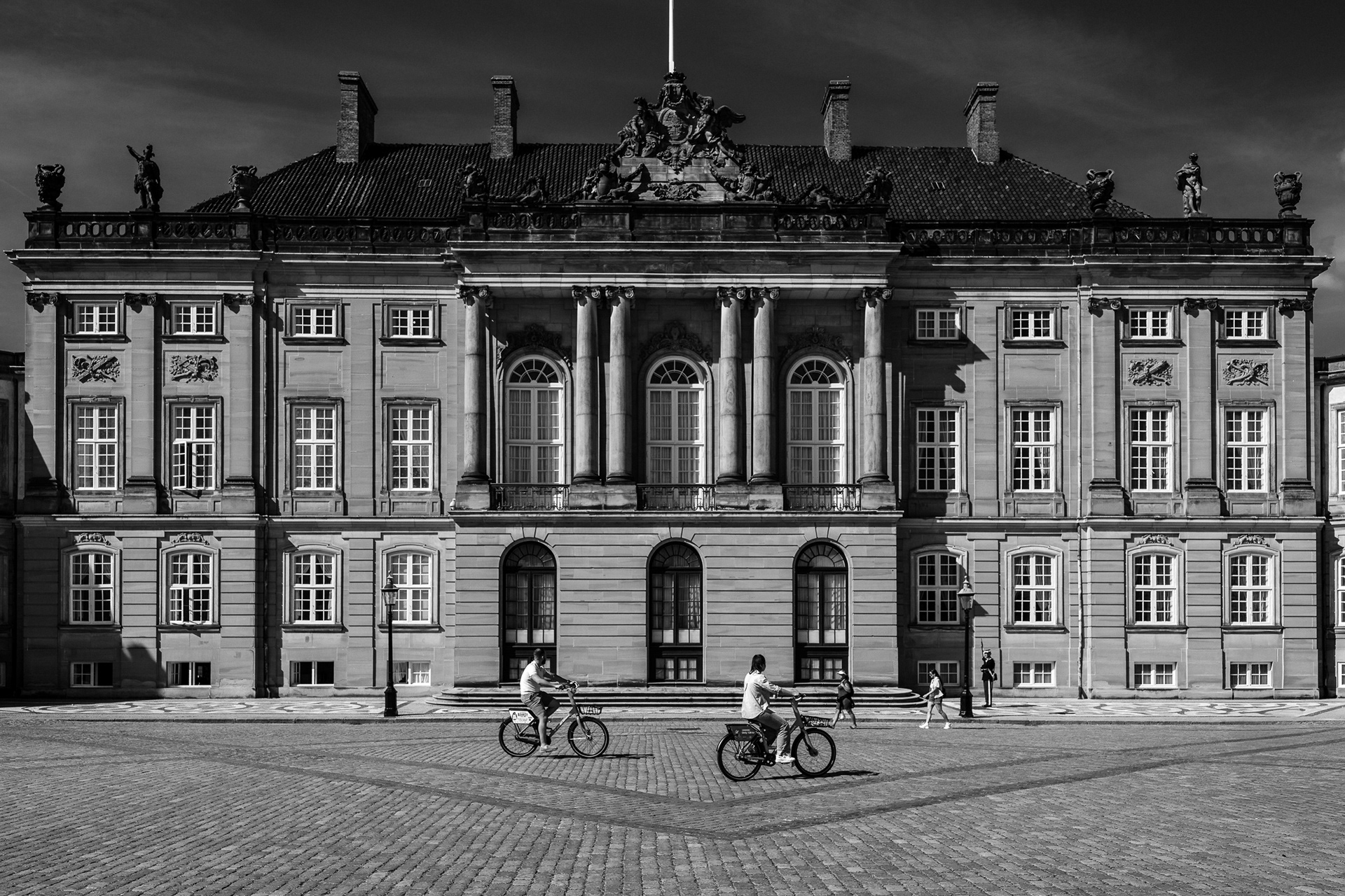 We began at Nyhavn, where the late summer light hits the masts of the old ships with a weighted, golden luster. But the real story of Copenhagen is found in the 'Negative Space'—the silent, synchronized dance of the cyclists crossing the palace squares and the royal guards standing as vertical anchors against grey stone.